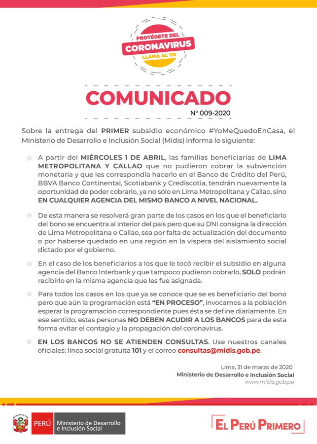 COMUNICADO MIDIS: PRIMERA ENTREGA DE SUBSIDIO ECONÓMICO #YOMEQUEDOENCASA