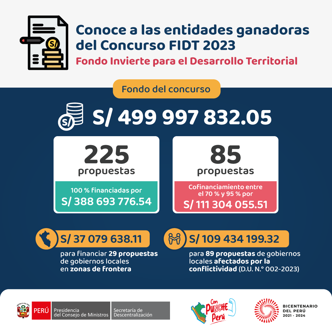 El Consejo Directivo del Fondo Invierte para el Desarrollo Territorial – FIDT, liderado por la Presidencia del Consejo de Ministros, a través de la Secretaría de Descentralización y la Dirección General de Programación Multianual de Inversiones del Ministerio de Economía y Finanzas, informa que mediante Acta N°20 de la sesión del Consejo Directivo del FIDT de fecha 24 de mayo, seleccionó la lista de propuestas del Concurso FIDT 2023, que recibirán financiamiento o cofinanciamiento para la elaboración de estudios de preinversión a nivel de perfil, fichas técnicas y ejecución de inversiones, la misma que comprende un total de 310 propuestas con un monto aproximado de inversión de medio millón de soles.