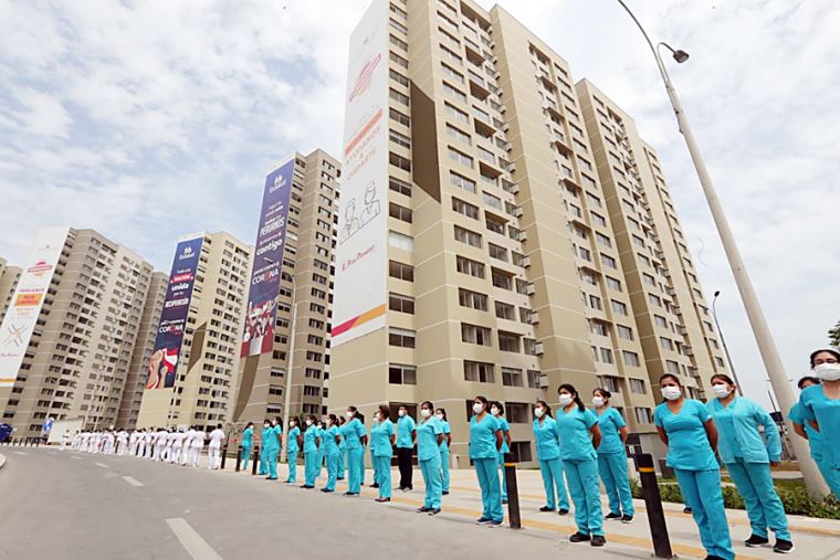 El mandatario, saludó a los trabajadores de la salud y efectivos de las fuerzas del orden que prestan servicio en estas instalaciones que fueron habilitadas en poco tiempo. Durante su recorrido, ingresó a los departamentos de la torre 1 que alojan a las enfermeras de turno y los pacientes que cumplen con el aislamiento correspondiente. Precisamente, debido a la emergencia sanitaria, se han habilitado las torres 1 y 2 para el aislamiento de más pacientes sospechosos y confirmados por coronavirus, con cuadros leves. Se tiene una capacidad regular de 900 camas.