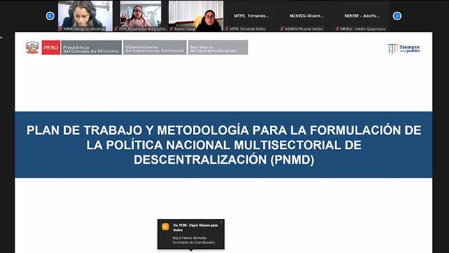 Bajo la conducción de la Secretaría de Descentralización (SD) de la Presidencia del Consejo de Ministros, esta tarde se realizó la segunda reunión del Grupo de Trabajo a cargo de la elaboración de la propuesta de la Política Nacional Multisectorial de Descentralización al 2030, que acordó importantes avances para este significativo instrumento de desarrollo territorial.
