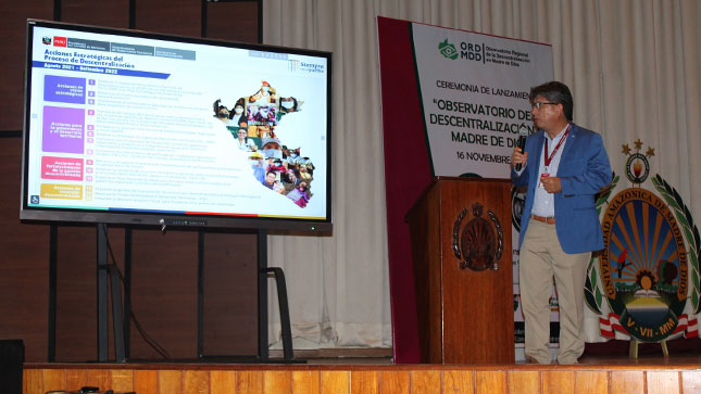 Con la presencia del secretario de Descentralización de la PCM, Yuri Chessman Olaechea, se desarrolló la ceremonia de lanzamiento del Observatorio Regional de Descentralización de Madre de Dios, en las instalaciones de la Universidad Nacional – UNAMAD de esa región.