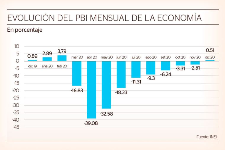 La economía peruana retrocedió 39.8% en abril, para luego empezar un gradual avance en mayo (-32.58%), junio (-18.33%) y así sucesivamente, hasta lograr recién al cierre de diciembre un leve crecimiento de 0.51%.
