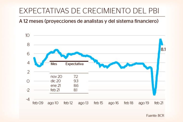 El panorama empieza a optimizarse, el Fondo Monetario Internacional (FMI) mejoró en febrero último su proyección de crecimiento para la economía peruana a 9% desde el 7.3% previsto en su anterior informe . Esta expansión para este año no solo se sustenta en el rebote estadístico, sino también en la mejor cotización del cobre en los mercados internacionales, principal producto de exportación del país; la libra de este metal está por encima de los 4 dólares; también se espera que contribuya una mayor inversión pública.
