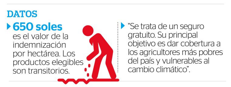 En este caso se establece un valor asegurado (monto de indemnización) por hectárea, igual para todos los cultivos. “El valor de indemnización es de 650 soles por hectárea. En tanto, los cultivos elegibles son productos transitorios en que figuran los básicos, hortalizas, pastos y forrajes”.